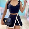 1- Diseño femenino: Blusa corta negra con lazos en los tirantes, añadiendo un toque delicado y moderno a tu look.