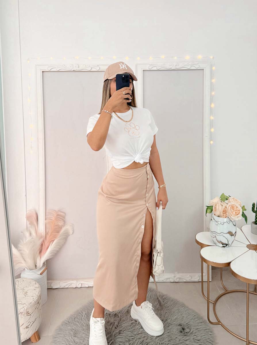 1- Diseño sofisticado: Falda dorada con un brillo delicado que aporta un toque de glamour único.