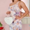 1- Estilo sofisticado: Vestido formal y elegante blanco sublimado con lila y naranja, que destaca por su diseño refinado y moderno.